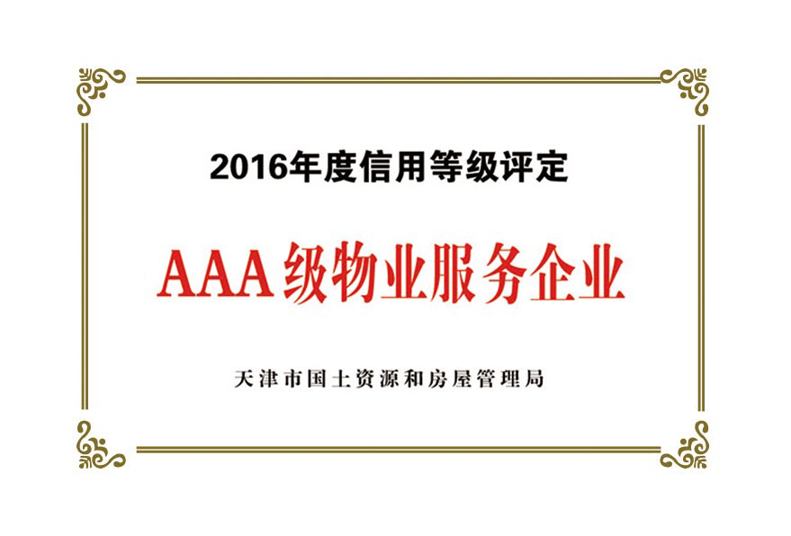 公司目前被授予:中國保安協(xié)會理事單位、物業(yè)管理綜合實力入圍企業(yè)、天津市物業(yè)協(xié)會理事單位、天津市保安協(xié)會常務理事單位、天津市保潔協(xié)會明星企業(yè)、天津市科技小巨人企業(yè)、天津市科技型企業(yè)、天津市物業(yè)管理企業(yè)優(yōu)秀項目經理、企業(yè)信用評價體系AAA級企業(yè)、AAA級誠信經營示范單位、AAA級重合同守信用單位、2017年被天津市工商業(yè)聯(lián)合會評為天津市民營企業(yè)促進就業(yè)百強企業(yè)、社會捐贈百強企業(yè)、2018年銷售收入百強企業(yè),2020年被天津市退役軍人事務局評為天津市吸納退役軍人就業(yè)先進單位。